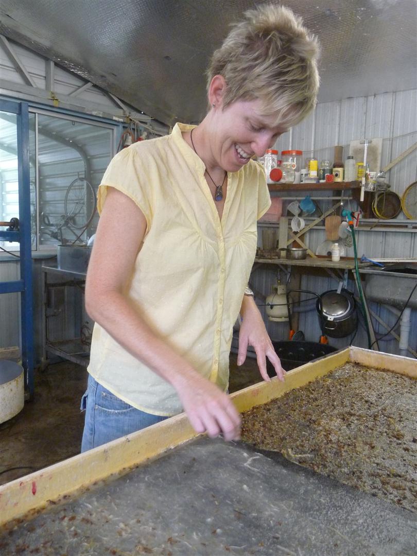 | Ngaire in full flight working on her sheet, she's tossing her fibre onto the vacuum table with great creative energy! |
